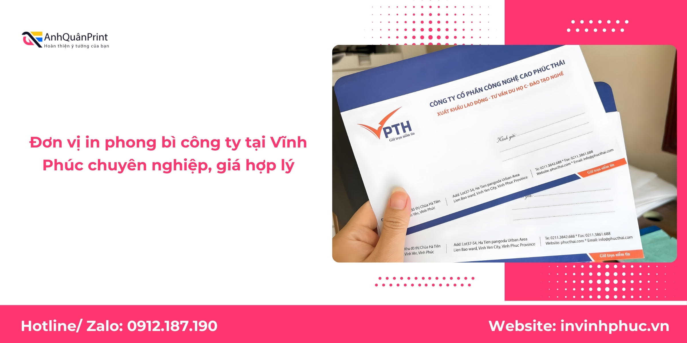 Bạn đang tìm kiếm địa chỉ in phong bì công ty tại Vĩnh Phúc chuyên nghiệp, giá hợp lý và giao hàng nhanh? Phong bì là ấn phẩm văn phòng quan trọng, góp phần thể hiện sự chuyên nghiệp và uy tín của doanh nghiệp trong mọi giao dịch. Cùng In Vĩnh Phúc tìm hiểu