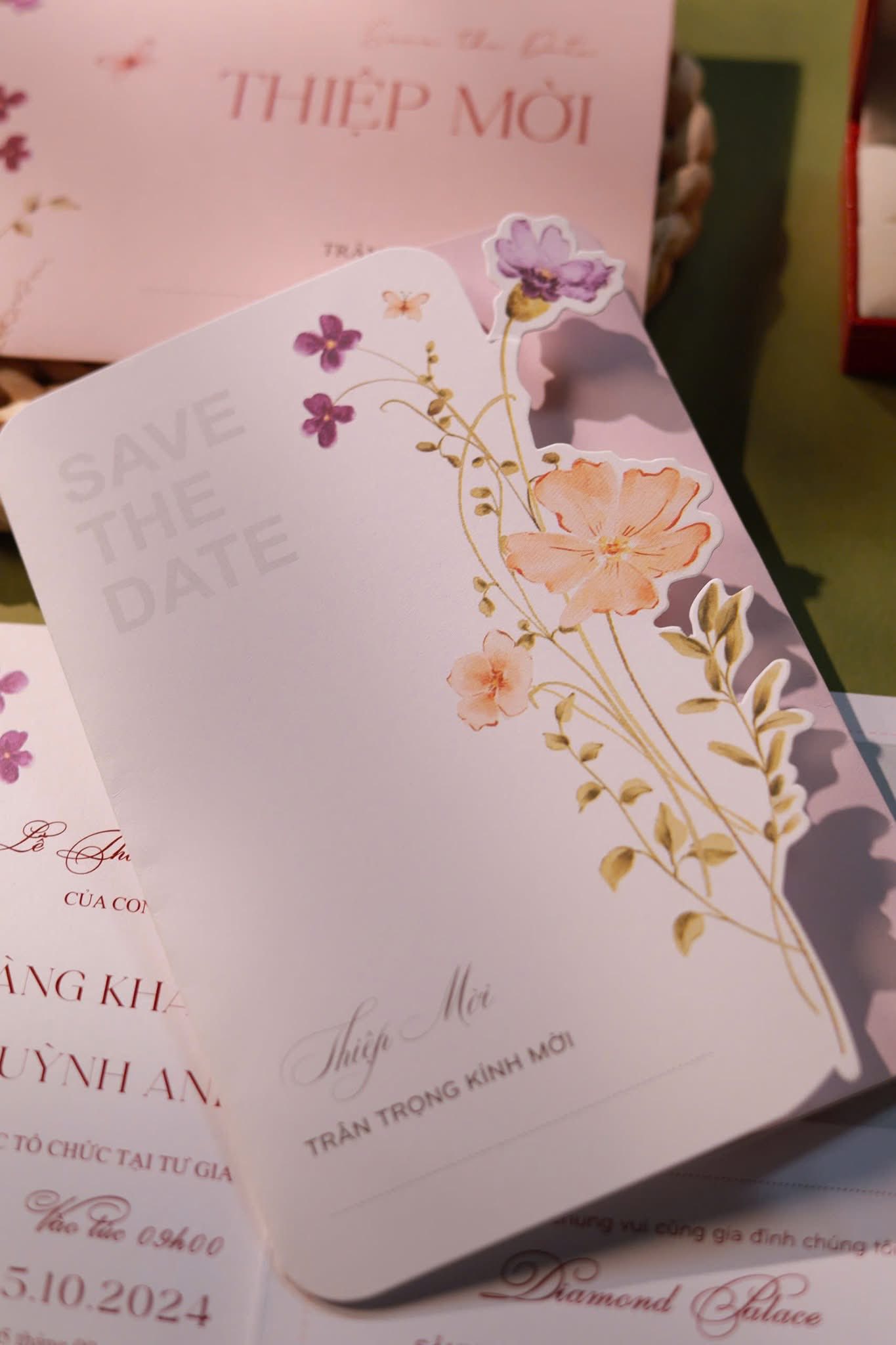 - Thiết Kế Độc Quyền: Nổi bật với phần “SAVE THE DATE” in mờ, tạo điểm nhấn hiện đại, và thông tin tiệc cưới được trình bày rõ ràng, dễ đọc.