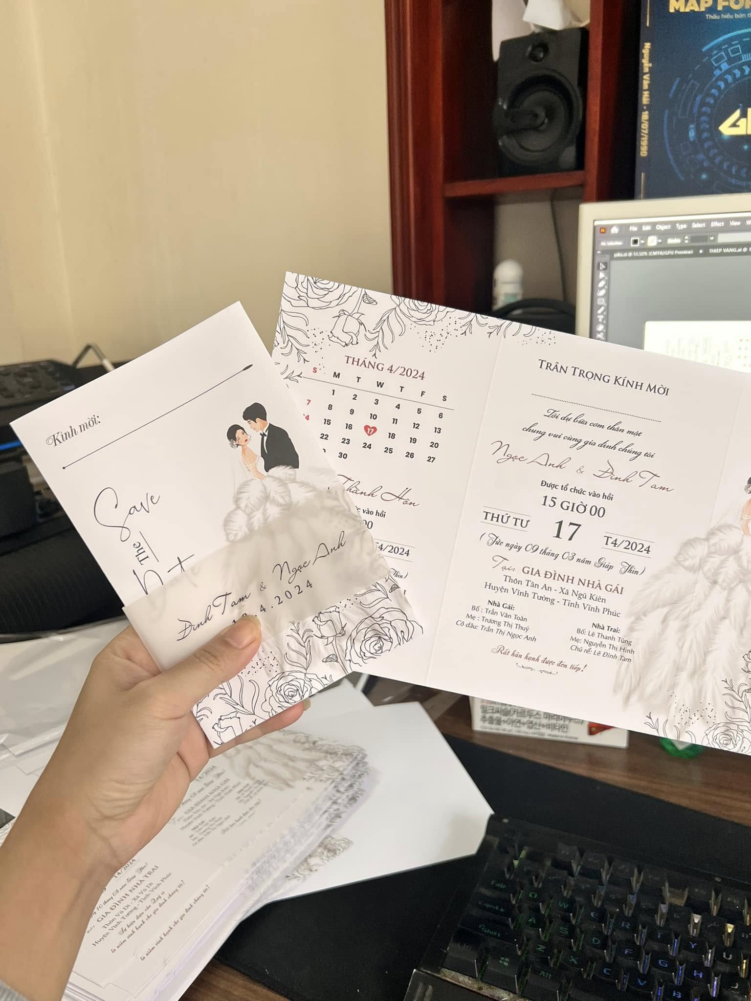 - Thiết Kế Độc Đáo: Bao gồm cả phần “Save The Date” (ghi nhớ ngày cưới) kèm theo lịch tháng 4/2024, giúp khách mời dễ dàng đánh dấu và sắp xếp thời gian.
