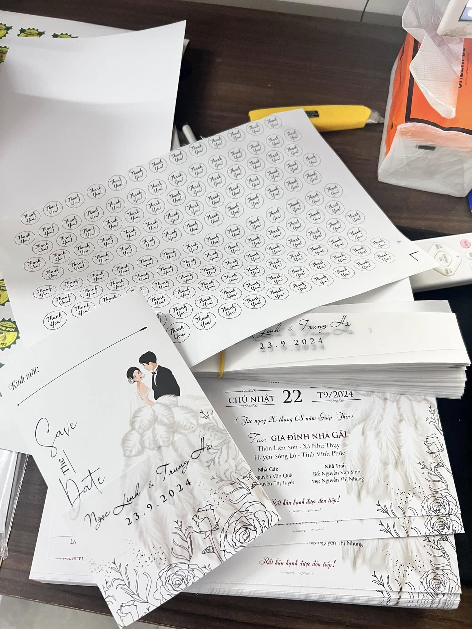 - Kèm sticker “thank you”: đặc biệt tặng kèm sticker “thank you” cùng tông, giúp cặp đôi dễ dàng dán lên phong bì hoặc thiệp cảm ơn khách sau tiệc cưới.