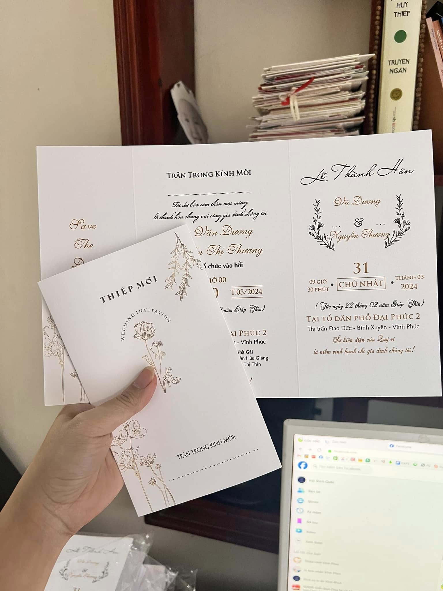 - Phụ kiện: có kèm theo thiệp mời nhỏ bên trong (inner card) được thiết kế đồng bộ với họa tiết hoa lá nét mảnh.