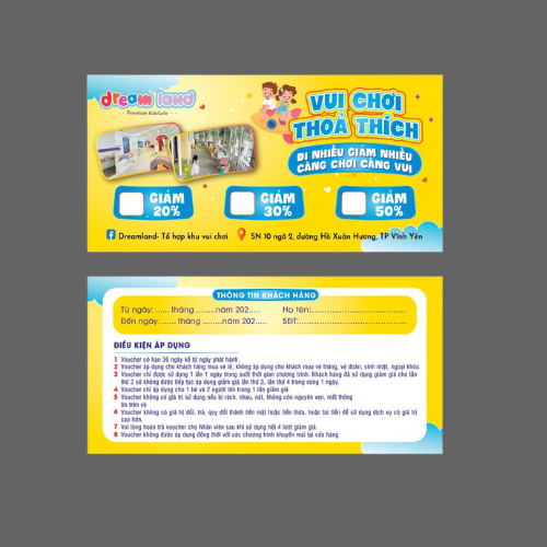 In Voucher Giảm Giá là công cụ marketing hiệu quả, được thiết kế để thu hút khách hàng mới bằng việc cung cấp nhiều mức chiết khấu hấp dẫn (Giảm 20%, 30%, 50%). Voucher được thiết kế hai mặt, tối ưu cho việc quảng cáo và quản lý dữ liệu khách hàng.