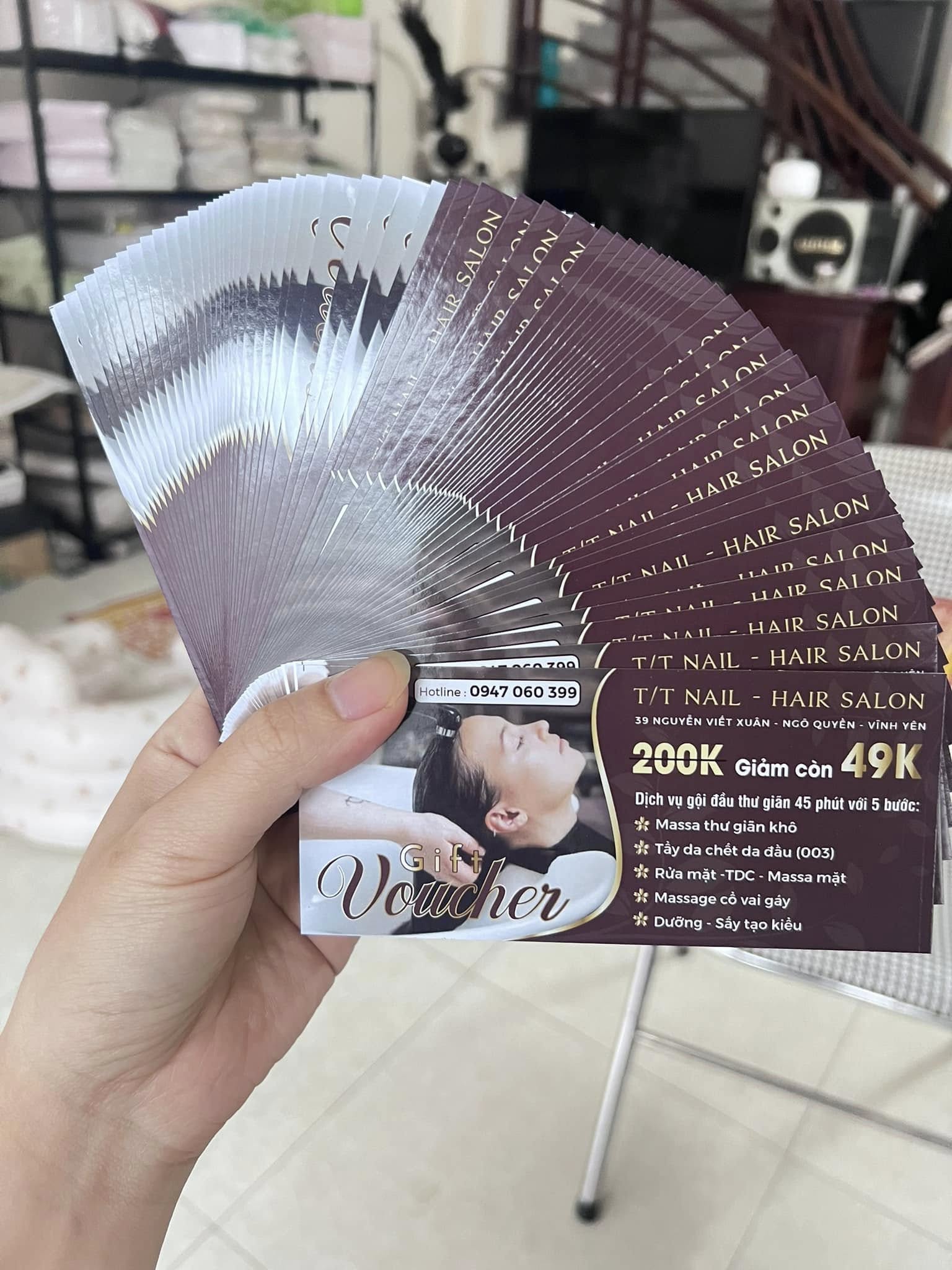 - Nội dung: Liệt kê chi tiết dịch vụ được hưởng (Gội đầu thư giãn 45 phút với 5 bước chuyên sâu), địa chỉ, và hotline liên hệ.