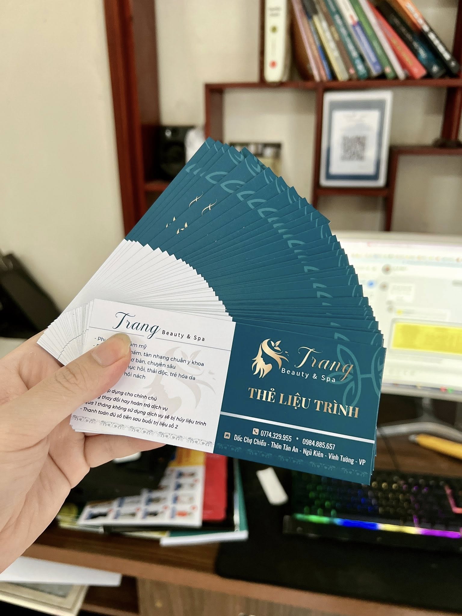 In Voucher Thẻ Liệu Trình Spa Tông Xanh Ngọc là công cụ quản lý và marketing cực kỳ hiệu quả, bởi nó tích hợp hai chức năng quan trọng: phiếu ưu đãi (voucher) để thu hút khách hàng mới và thẻ liệu trình để quản lý tiến trình của khách hàng cũ. Thiết kế xanh ngọc/vàng đồng sang trọng, thể hiện sự chuyên nghiệp của cơ sở spa.