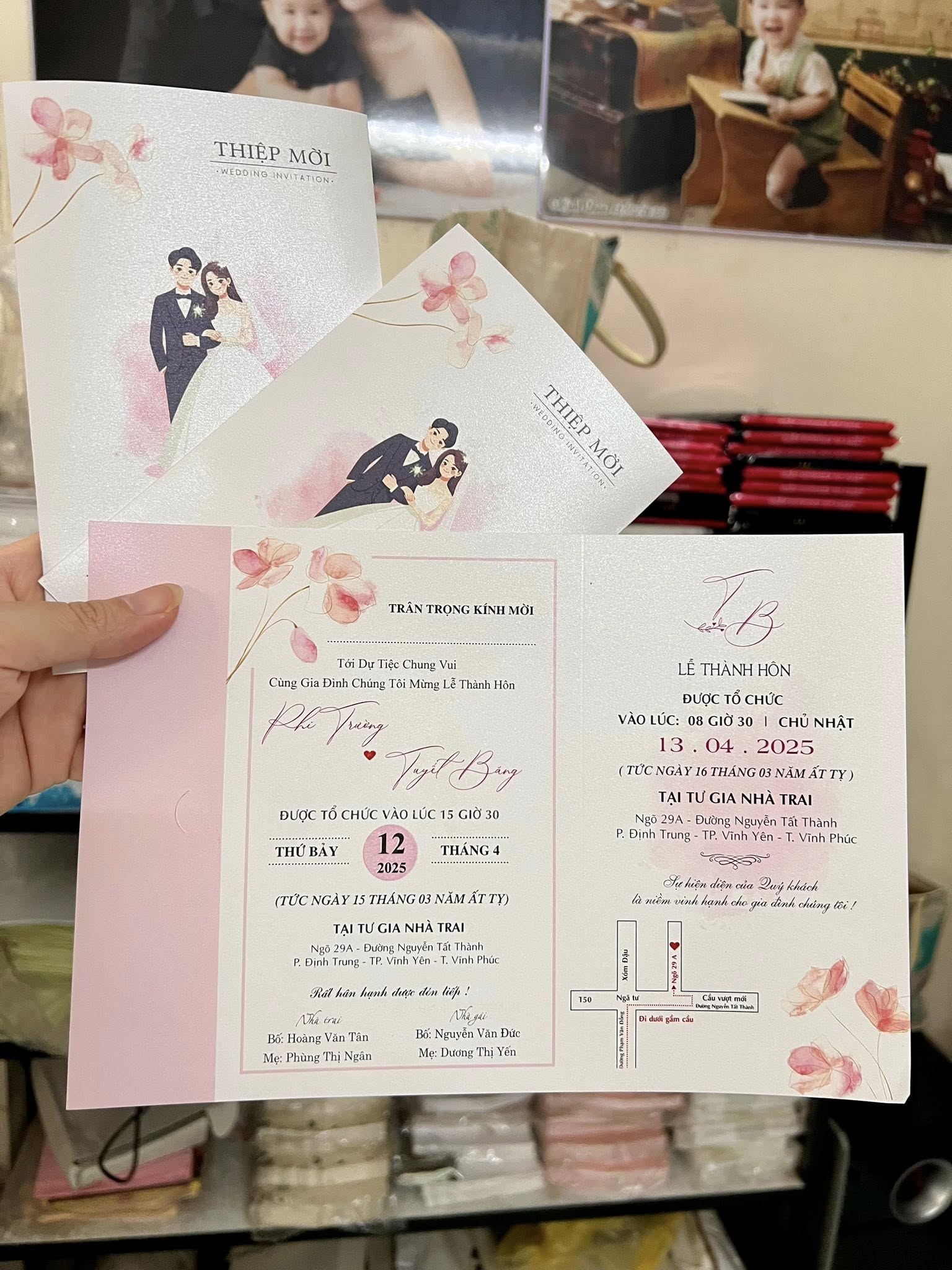 Thiệp được in trên giấy mỹ thuật ánh ngọc (shimmer) cao cấp, tạo hiệu ứng lấp lánh sang trọng dưới ánh sáng. Bên trong bố cục rõ ràng, dễ đọc, phối hợp font chữ hiện đại và thanh thoát – thể hiện sự chỉn chu trong từng chi tiết.